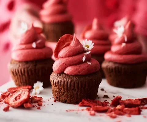 Suklaakuppikakkuja kermaisella mansikkakuorrutteella